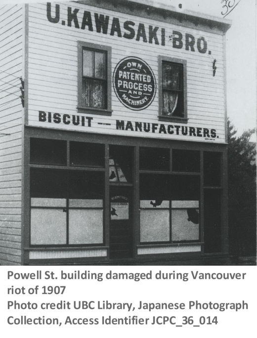 The fears, hate, and discrimination culminated in the Vancouver Riot on September 7, 1907 in which a mob of anti-Asian protestors rampaged through the Japanese and Chinese districts in Vancouver. While there were no deaths, there was substantial property damage for which some Japanese businesses were compensated up to $2,500. More importantly the riot resulted in the Hayashi-Lemieux Agreement between Canada and Japan in 1908 that limited the annual number of male labourers and domestic servants to 400. This was the first step to further discriminatory measures. This Gentlemen’s Agreement was revised in 1928 restricting the number of Japanese immigrants to 150 including women and children.