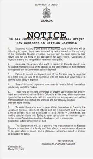On August 4, 1944, the Canadian government ordered Japanese Canadians to either apply for repatriation, also referred to as deportation, to Japan or to move east of the Rockies.