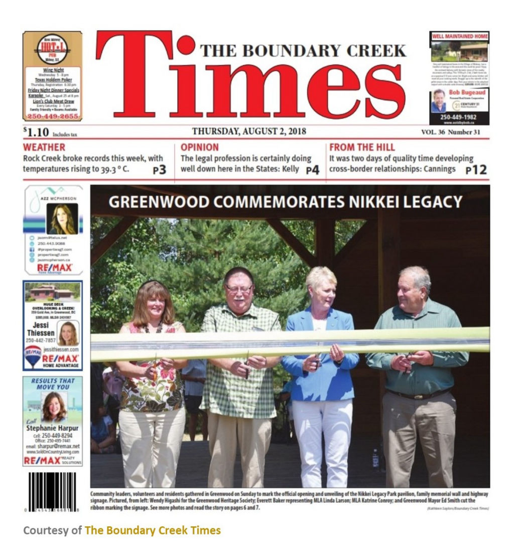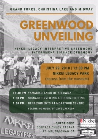 On July 29, 2018, a blistering hot day, an estimated 200 people descended on the Nikkei Legacy Park in Greenwood to remember the Nikkei who were interned there seventy-six years ago. Internees and their descendants, government representatives, local residents, and others interested in celebrating the occasion joined the unveiling of the Nikkei Legacy Park Project and the Nikkei Legacy Interpretive Greenwood Internment Signage.